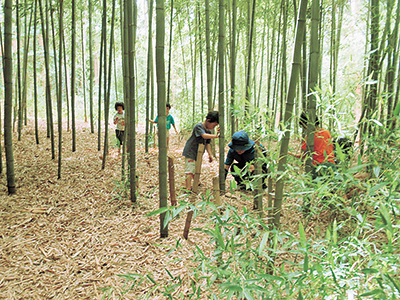 この絵は、大好きな裏山でみんなと遊んでいる姿を描きました。