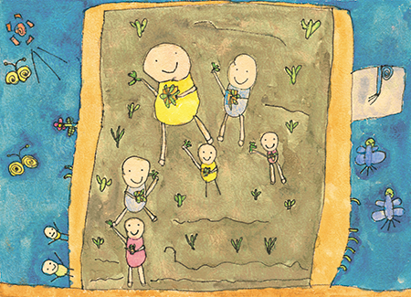 この絵を描いた子の家庭は、いろいろな苦労の中でも、8時登園をして園生活を気持ちよく送ることが出来るよう努力してくれました。この絵は田植え体験を描いています。