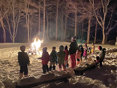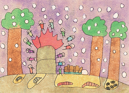 この絵は、自園の合宿で雪の降る森の中、キャンプファイヤーをして『森は生きている』の世界をみんなで楽しんでいる場面です。