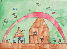 30人定員でスタートしたおおつ保育園は、開園33年目を迎えます。近くには、自然に恵まれた山や公園、土手があり、子どもたちの散歩の楽しみは筍掘り、野いちご摘み、栗拾いなど季節の味です。また、小規模園ならではの異年齢の自然な関わりを大切にしながら、生き生きと活動する子ども、自分で考えて行動する子ども、仲間を思いやる子どもを目指しています。3年前45人に定員を変更しました。他園との年長交流保育はステキな大人や子どもの姿を見たり、自分で判断する力を育てるなど、100人を超える大きい集団を体験できる場となっています。 今年の年長児はバングラデシュ国籍の男児1人を含む6人。4月当初一人ひとりは遊んでいるように見えるが、中途半端で遊びこめない子どもたちでした。大人が一緒に繰り返し遊ぶ中で、ルールを少しずつ変えたりトラブルが起きると皆で考えるなど次第に熱中するようになり、卒園式前日も誘い合って大好きな「氷鬼」を楽しんでいました。 長靴作りや雑巾縫いの取り組みでは、「できらん」と苛立ち、落ち込み、涙の出ることもありましたが、他の子と比べるのではなく「きれいにできたね」と子どもの変化を認め、「○○ちゃん がんばってるね」と子どもたちにもさり気なく伝えていきました。「できないこと、難しいことがあってもいいんだ、コツコツと頑張れば」「自分も素敵なところがいっぱいある」と自分自身のありのままを受け入れるようになってきました。そしてとび箱・竹馬では弱気になっている友達を励まし、仲間を認めあう集団になりました。無限の可能性を持って成長し続ける子どもたちに励まされた1年でした。 この6枚の絵は一人ひとりの存在が、仲間の成長を支えた子どもたちの絵です。 |